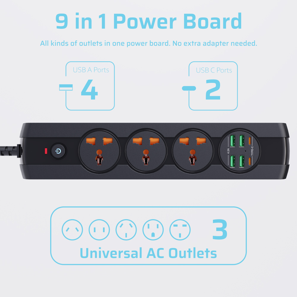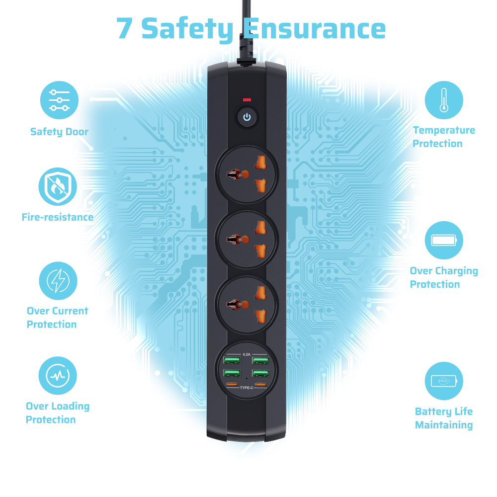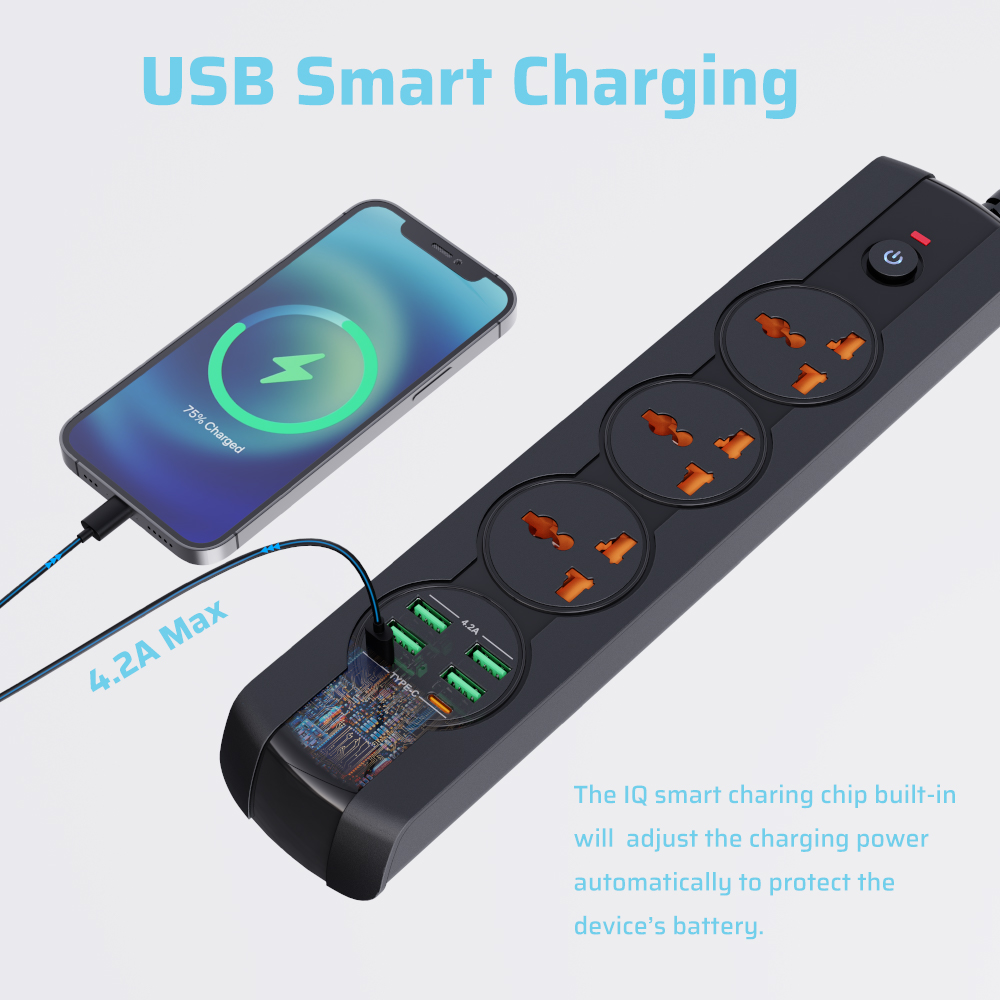 3 AC Sockets and 6 USB Ports–The 6 USB ports will automatically detect devices and deliver the optimal charging current, ensuring the fast and safest charging while protecting them from damage and data loss thanks to unique AUTO-ID technology.