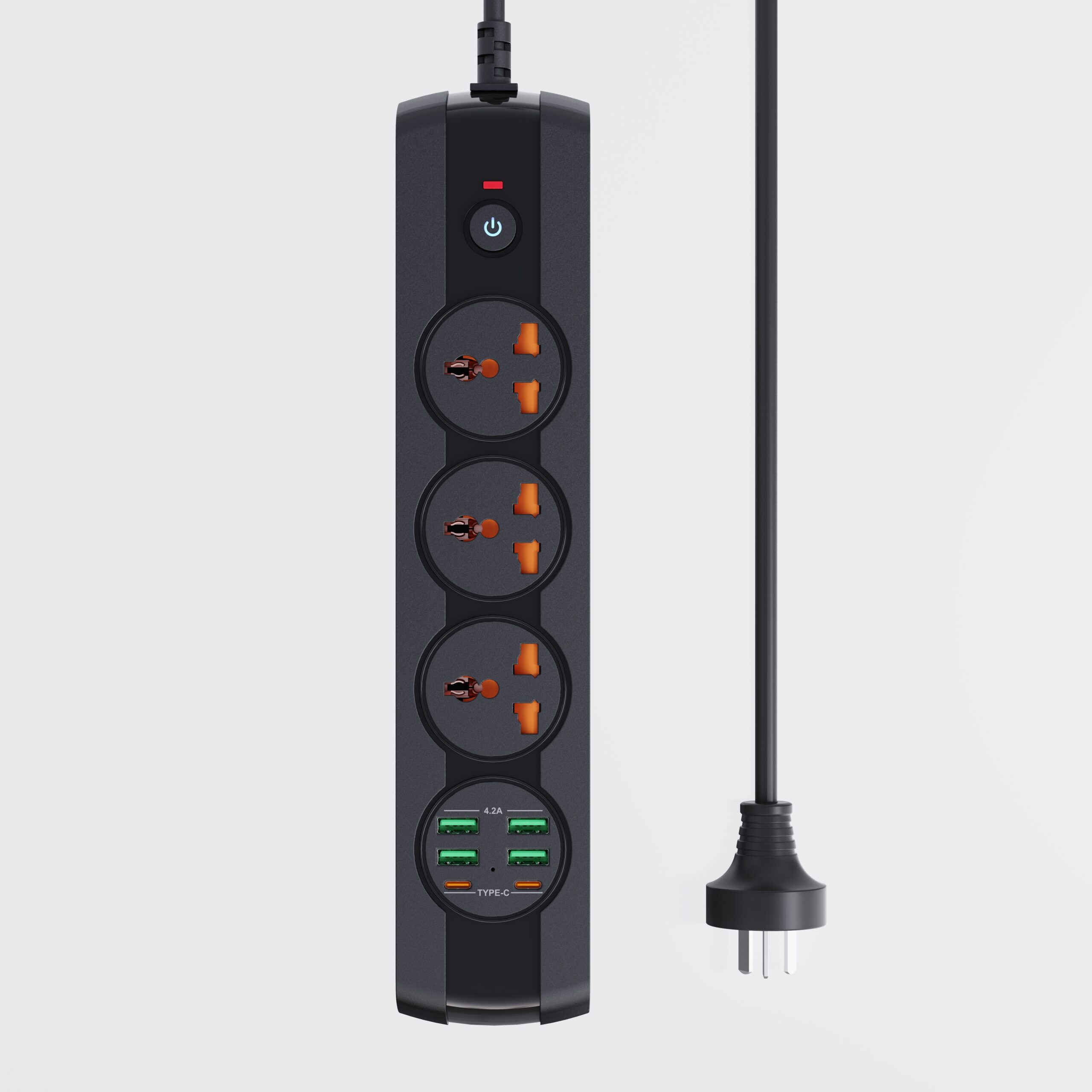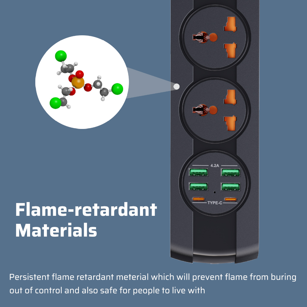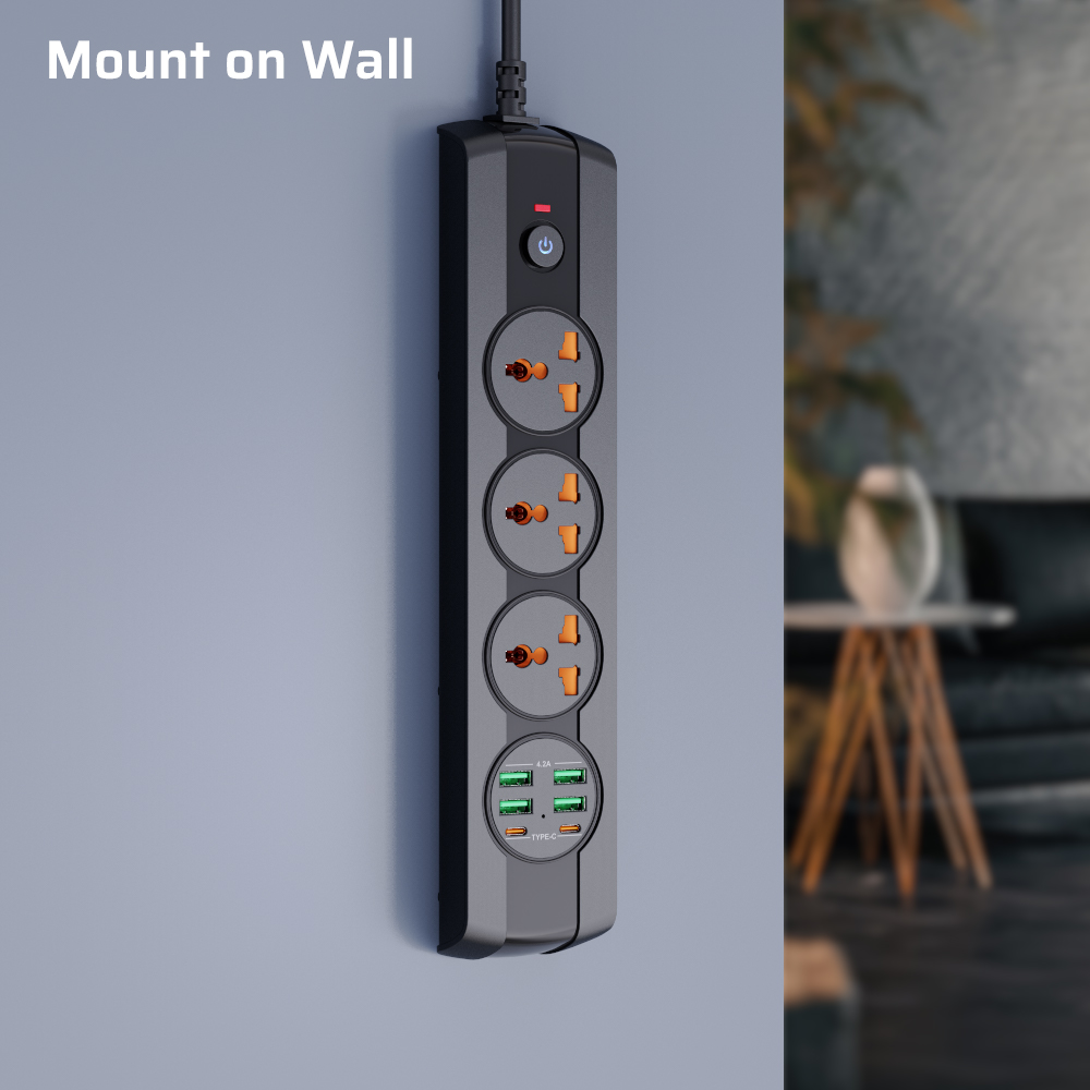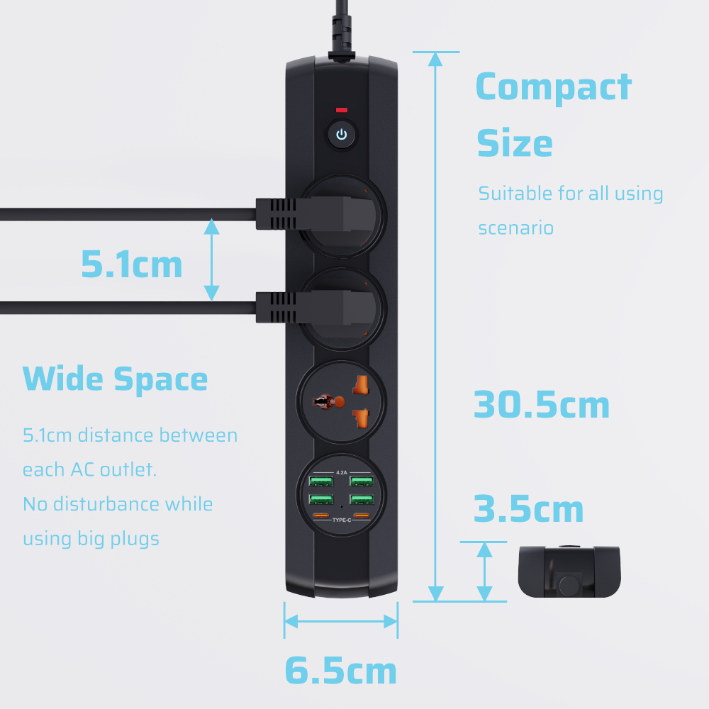 9-in-1 Designed Power Strip–Extension leads with 3 AC Sockets+ 6 USB ports perfect combination, safely charging up to 9 devices from a single wall charging unit. Max Capacity Up to 2500 Watt(max 250 Volt, 10 A), ideal for charging most office and household appliances such as computers, printers, televisions, ovens, microwaves, hair dryers, electric toothbrushes and etc.