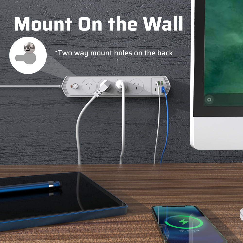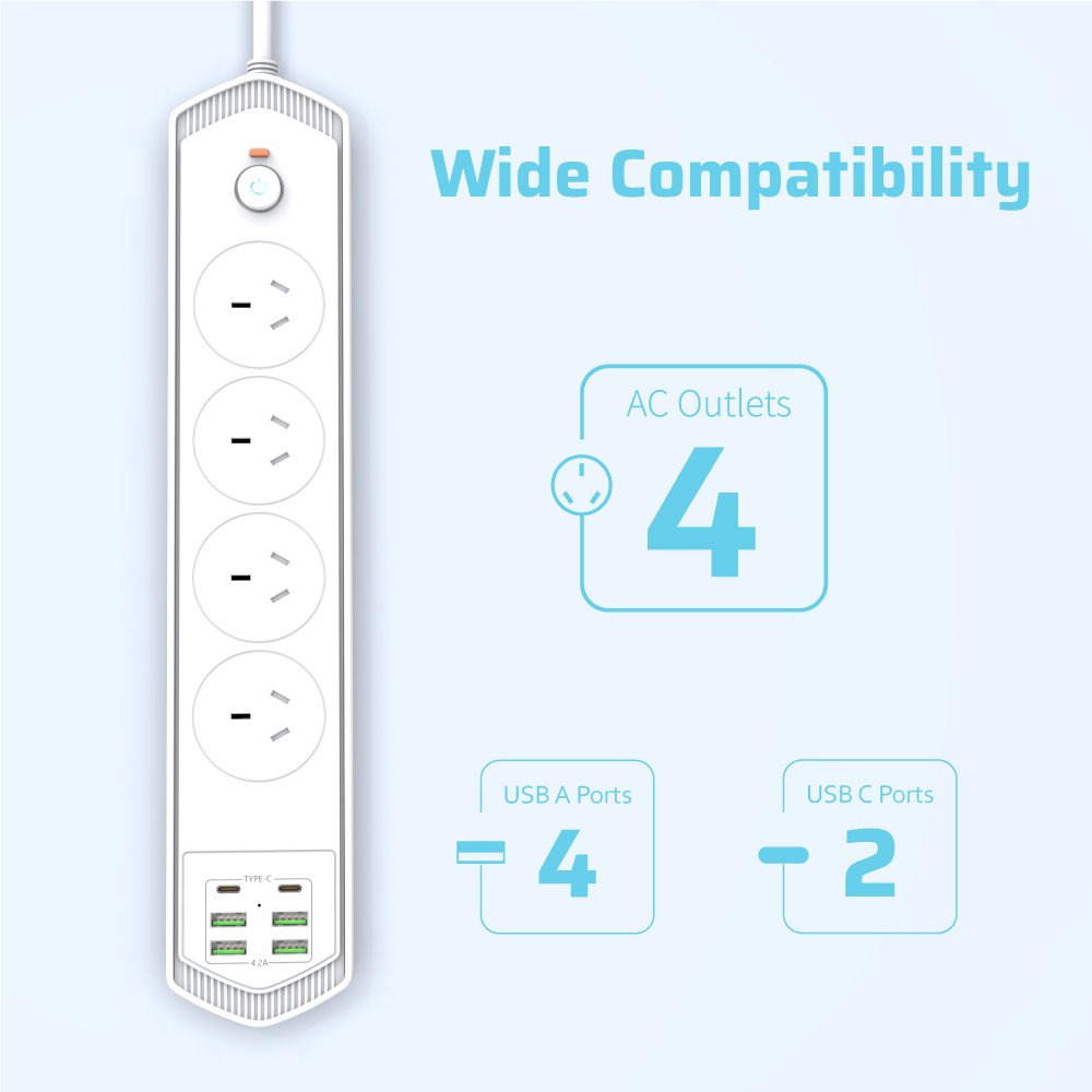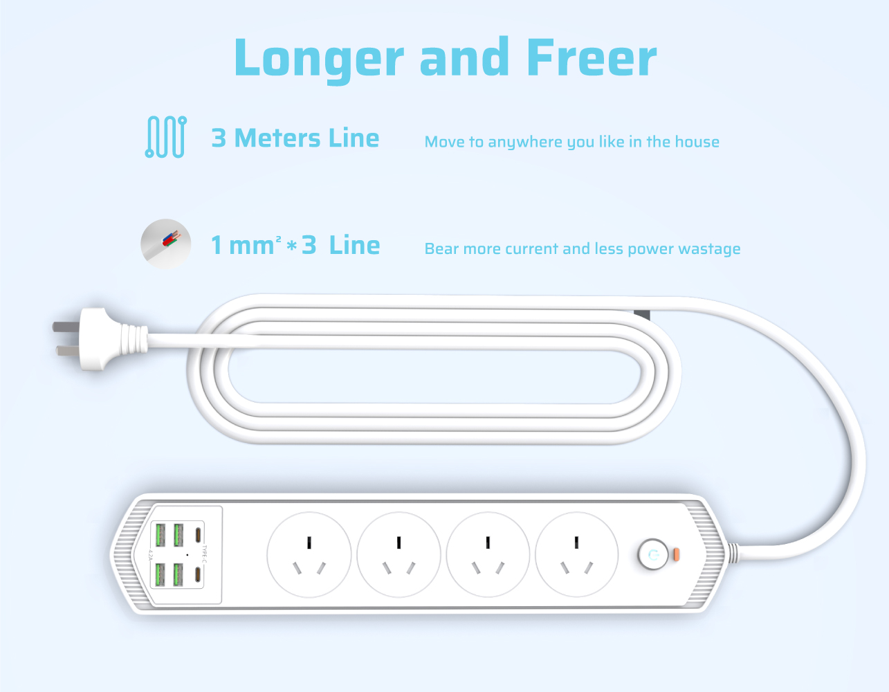 3M/10ft Extension cord Power Board –This versatile surge protector comes with a 3m extension cord for your convenience. Additionally, it is rated with 3000W of power and equipped with built-in protection against electrical spikes and surges for added safety.