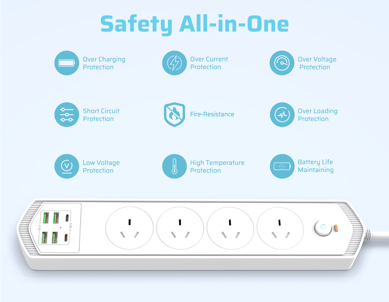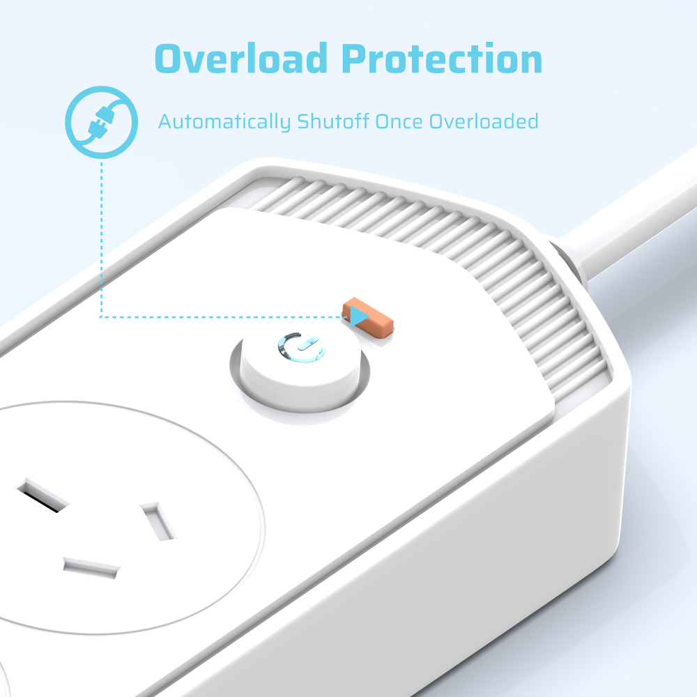 Safety and Certificate — extension cord and other major components certified by SAA. The over-current protection switch limits the power strip’s working current to a certain setting, so it will not get hot during usage. Environmental protection and fire-resistance PC shell with flame retardant at 1382℉ makes it more durable and longer lifetime.
